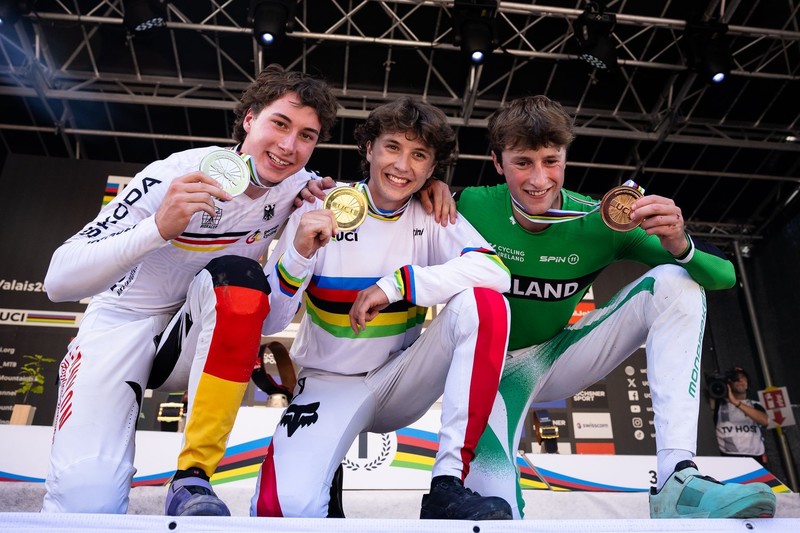 Henri Kiefer (li.) präsentiert stolz seine WM-Silbermedaille. Foto: Boris Beyer 09.09.2025 | Champéry (rad-net) - Henri Kiefer hat am vergangenen Wochenende bei den Mountainbike-Weltmeisterschaften in der Schweiz als erster deutscher Downhiller in der Elite-Klasse der Männer den Sprung aufs Podest geschafft. Ein Porträt über den derzeit schnellsten deutschen Biker.